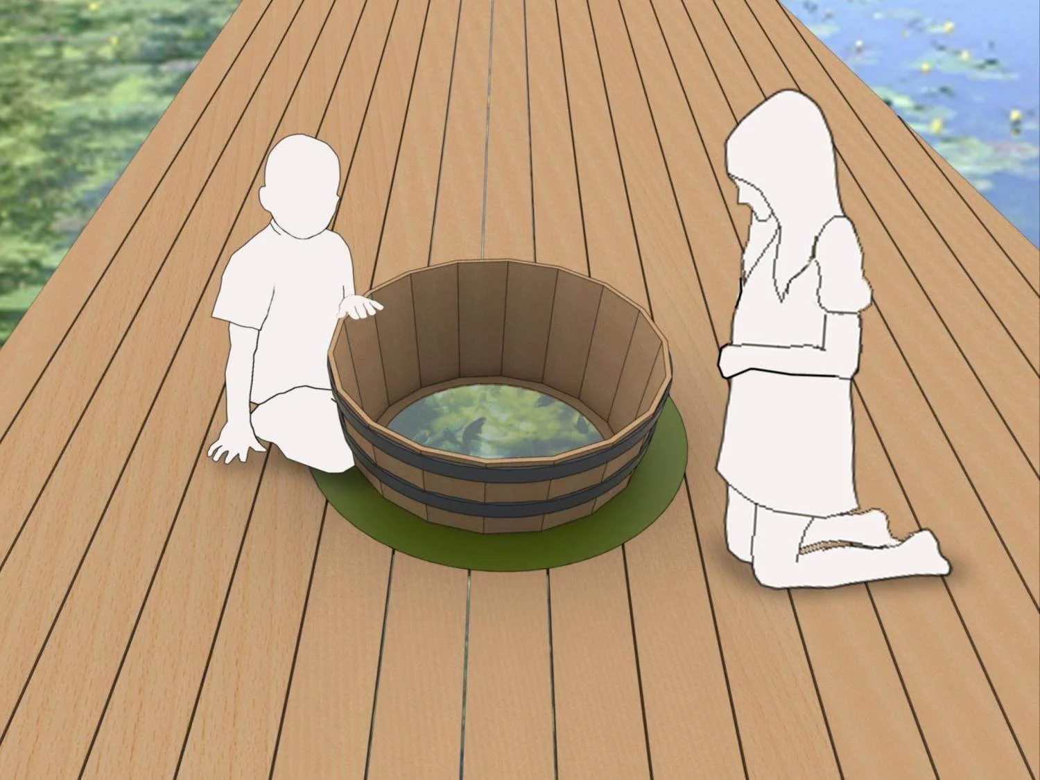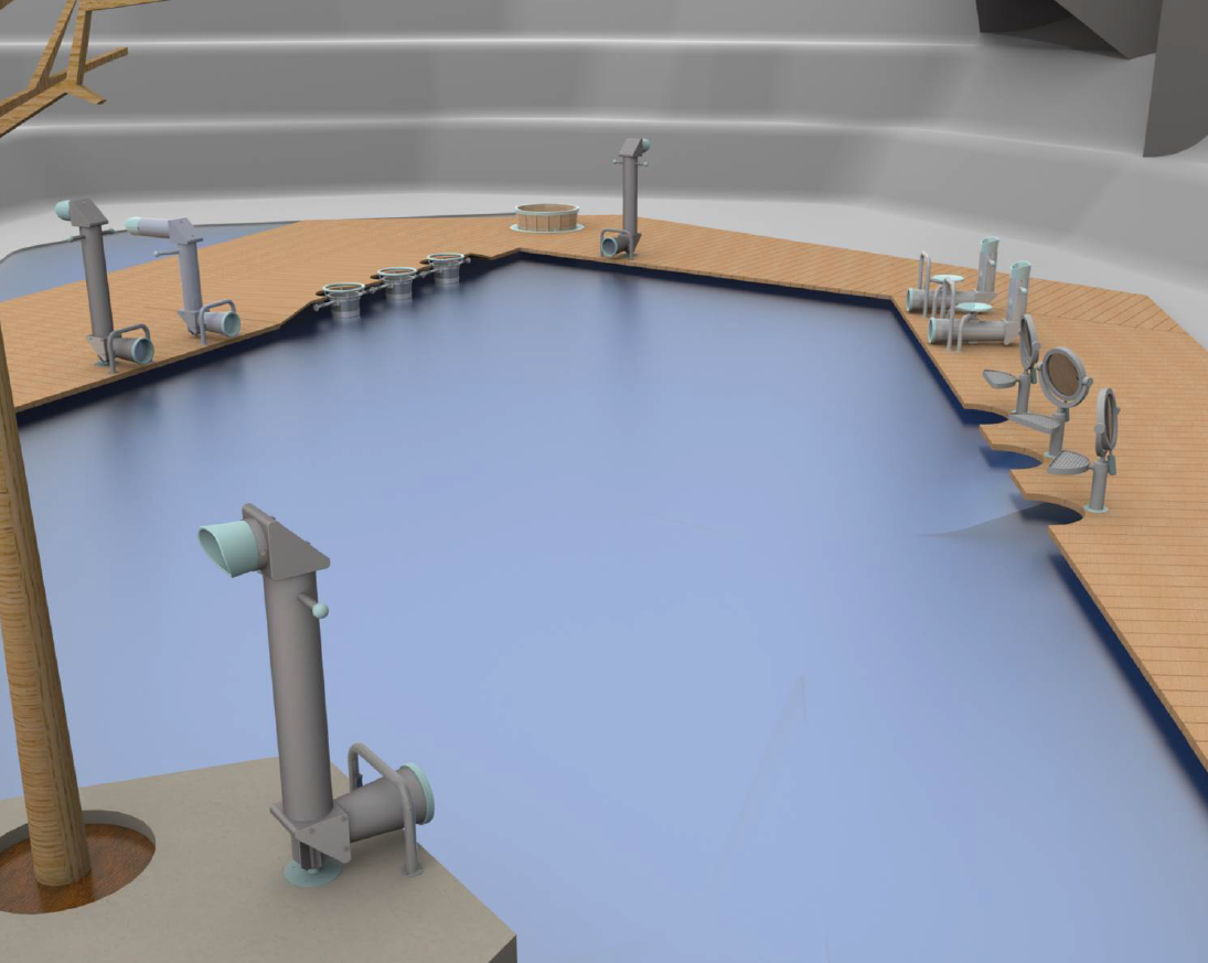 Responsibility focused on two areas: a water-oriented zone surrounding a pond and a rocky play area along the trail. The work included spatial design and arrangement of interactive elements, as well as the design of individual play and learning elements, balancing safety, engagement, and integration with the natural environment.