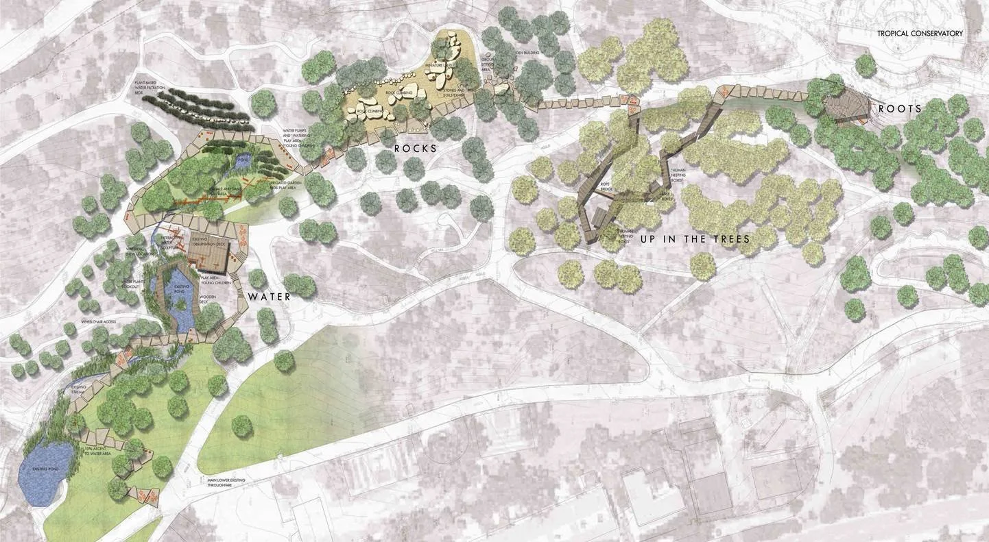 The Children’s Discovery Trail was developed as a sequence of interactive zones distributed throughout the Botanical Gardens, encouraging exploration through movement, play, and observation. The trail guided children and families through distinct ecological areas, each highlighting specific natural phenomena. Hands-on elements invited engagement through touch, listening, climbing, and experimentation, transforming the landscape into an open spatial learning environment.