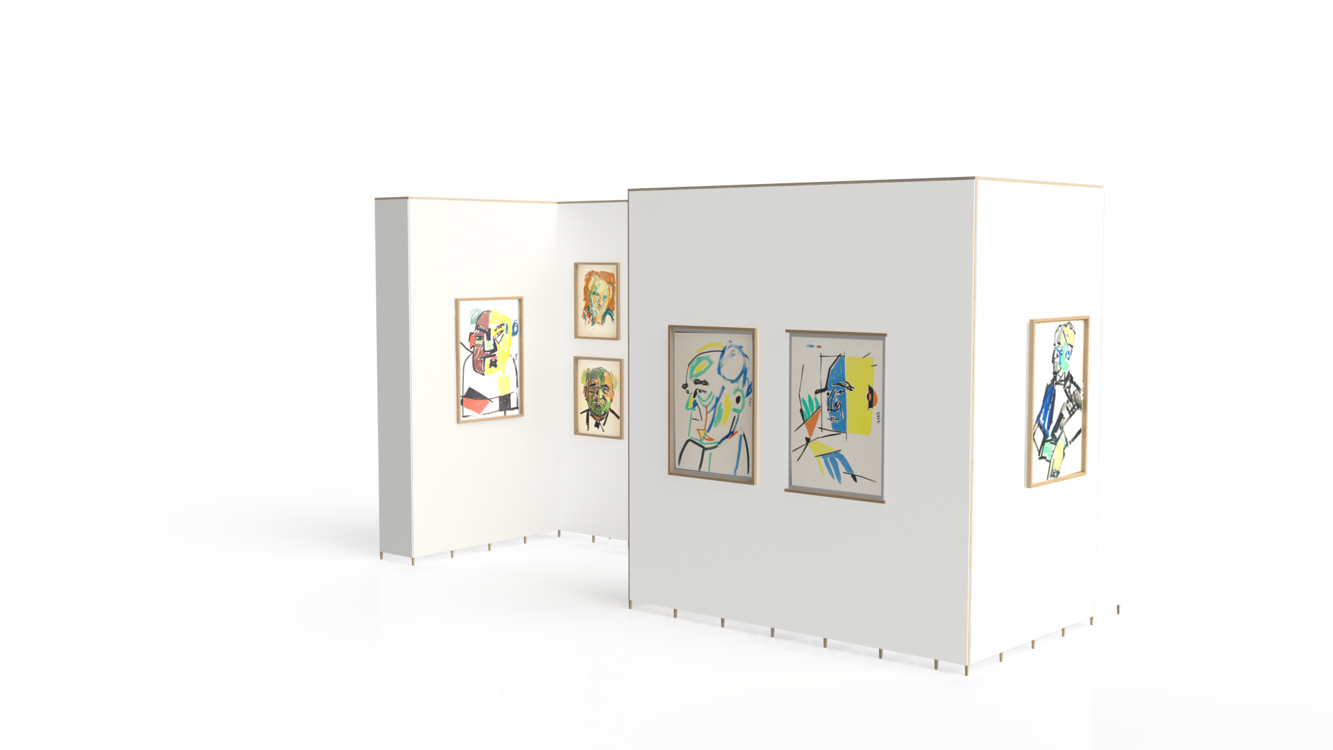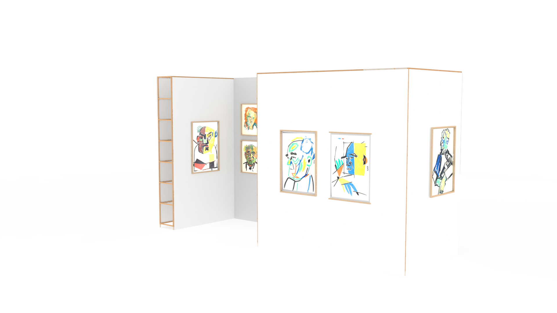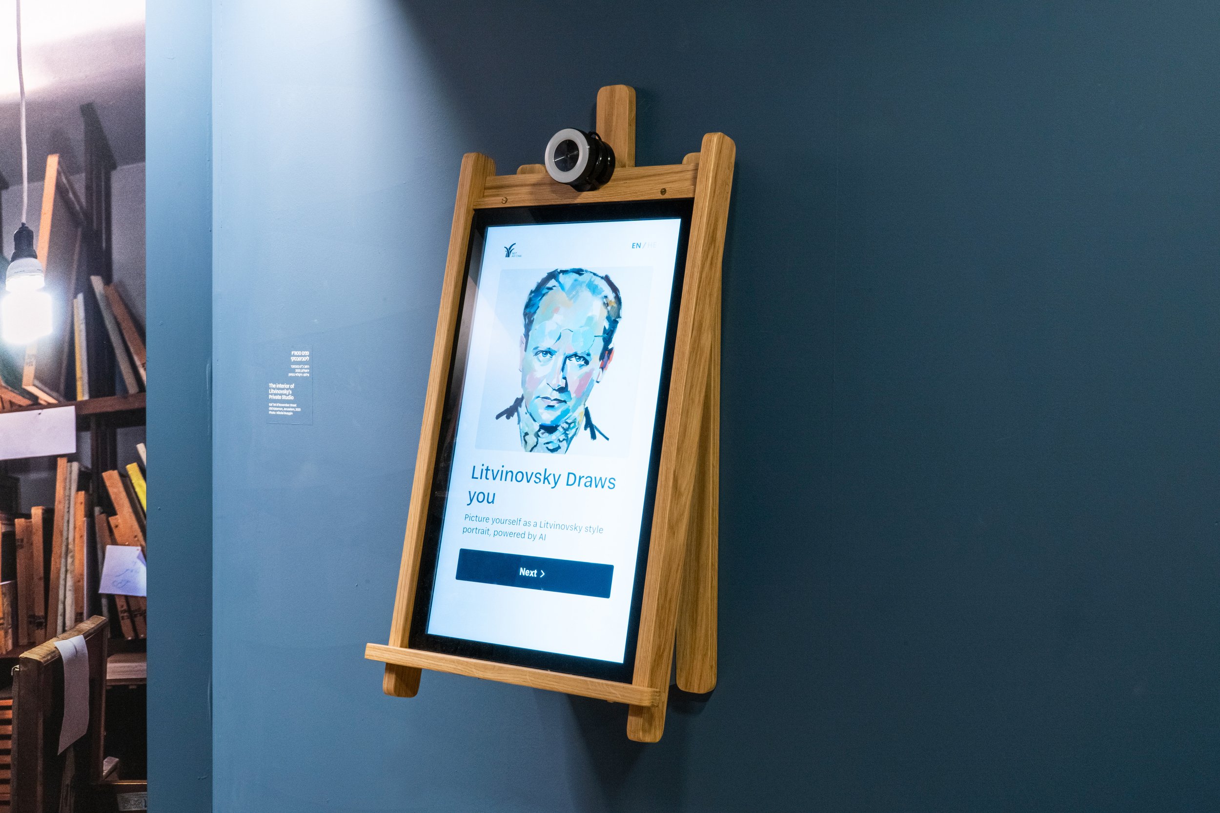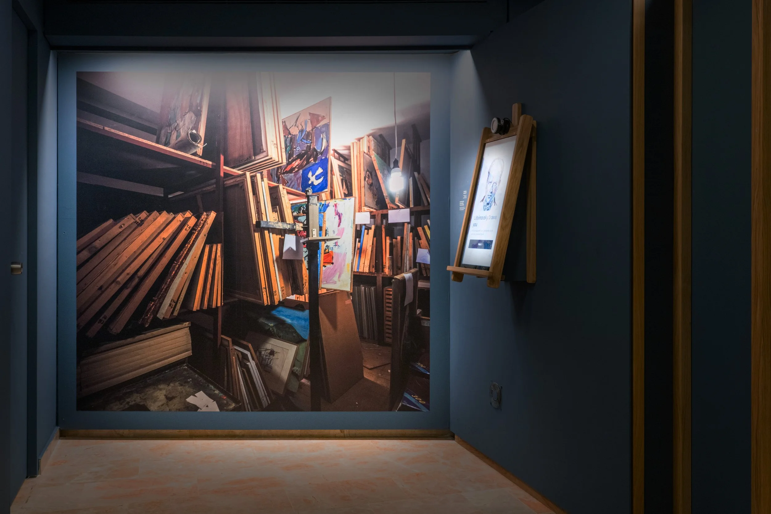 Gallery partitions echoed the layered, informal organization of Litvinovsky’s studio and storage spaces, evoking a sense of work in progress. A key design decision was the incorporation of an interactive AI element, allowing visitors to generate customized portraits in the styles explored by Litvinovsky. This digital, participatory feature enabled visitors to share their portraits online, drawing attention to the exhibition and extending engagement.