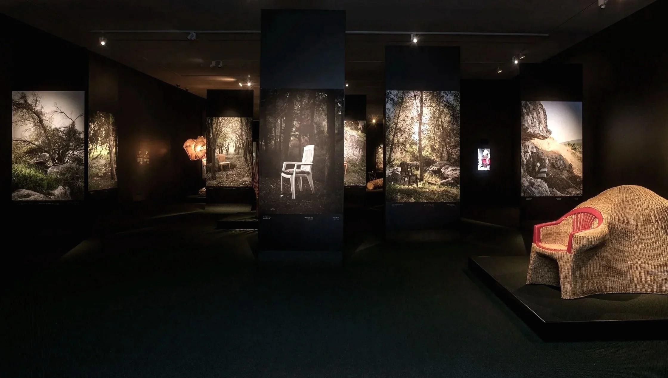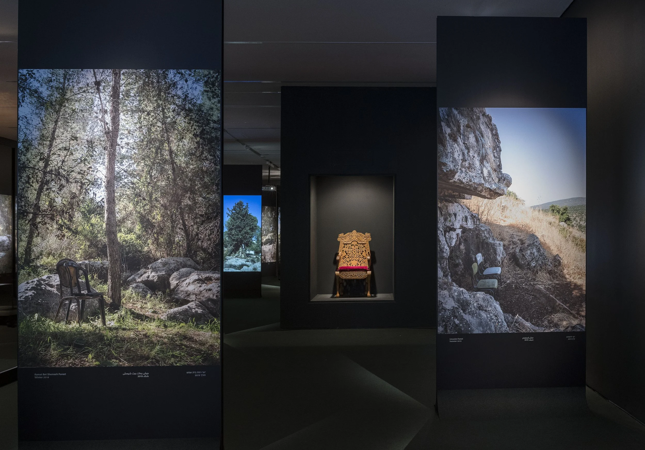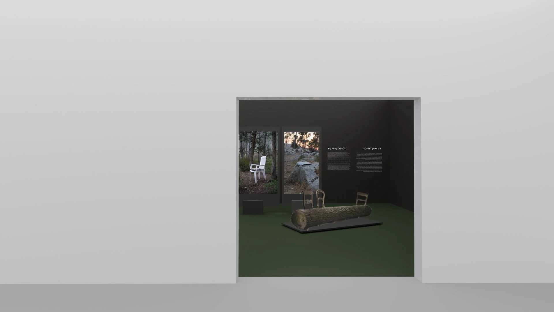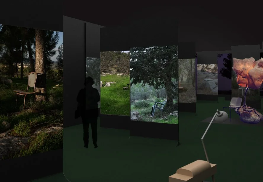 Photographs of these seats, documented in forests across Israel, were the central focus of the exhibition and displayed alongside chairs designed by contemporary artists such as Jurgen Bey and Nacco Carbonell. Initially without predefined size or format, the images were positioned as objects within the space, defining circulation and shaping spatial experience, turning a large open area into a landscape inspired environment and creating a space of wandering.